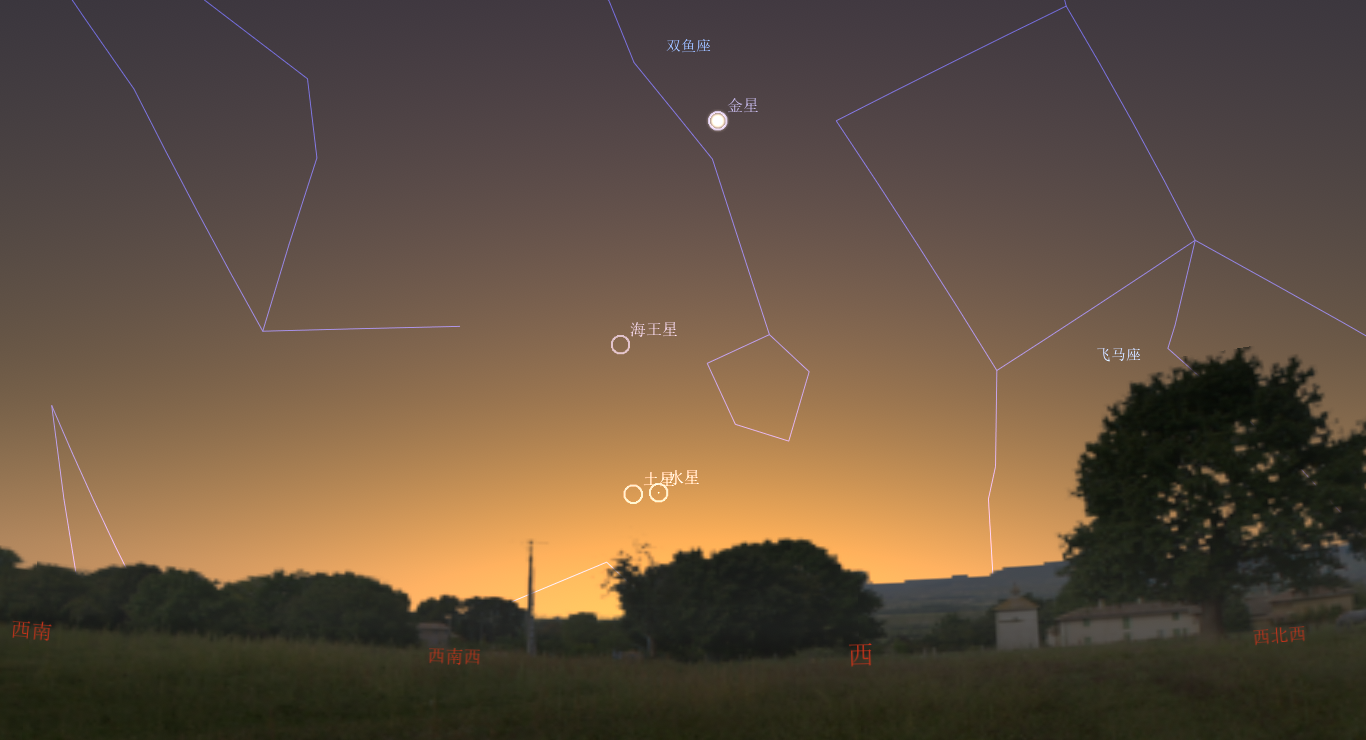 金星: 在双鱼座逆行。上半月日没后可见于西方低空,下半月接近太阳不易看见。视星等-4.8→-4.1→-4.2→-4.1→-4.3等,视直径48.8″→59.5″→57.4″。