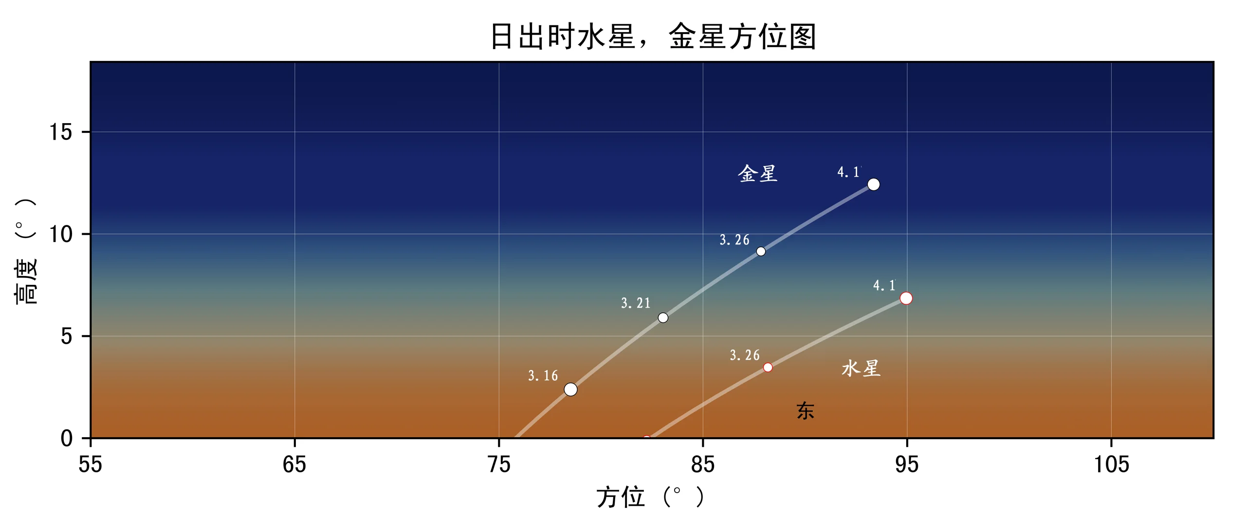 2025/03/25 03:48 水星下合日,水星在太阳以北3.6度,视星等+4.9等,视直径11.0″