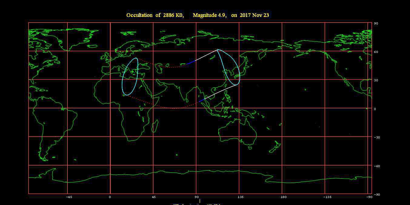 2017年11月23日,月掩天鸡二 发表于 2017-11-18 更新于 2024-06-16 分类于 recent-astronomical-events , 掩星 月亮的赤纬变化在+28.5~-28.5度。只要在离黄道不远的二十八星宿中,月亮每18.6年交点周期内就有机会掩蔽它们。 2017年11月23日(星期四)19时32分,月掩人马座4.9等恒星天鸡二,月龄初六。掩始现象,恒星由月球暗面消失。可利用双筒望远镜辅助观察。 R2886 = 56 Sagittarii = 天鸡二