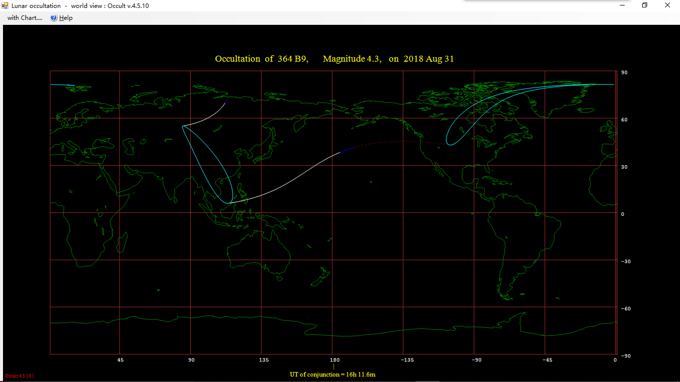 2018/8/31 月掩天囷六 发表于 2018-08-26 更新于 2024-06-16 分类于 recent-astronomical-events , 掩星 发布单位:香港天文学会 丨 观测方式: 月亮的赤纬变化在+28.5~-28.5度。只要在离黄道不远的二十八星宿中,月亮每18.6年交点周期内就有机会掩蔽它们。 2018年8月31日(星期五),月掩鲸鱼座4.3等天囷六,月龄廿一。掩终现象:22时56分,恒星由月球暗面出现。 R364 = xi 2 Ceti = 天囷六 香港天文学会掩星组组长余惠俊