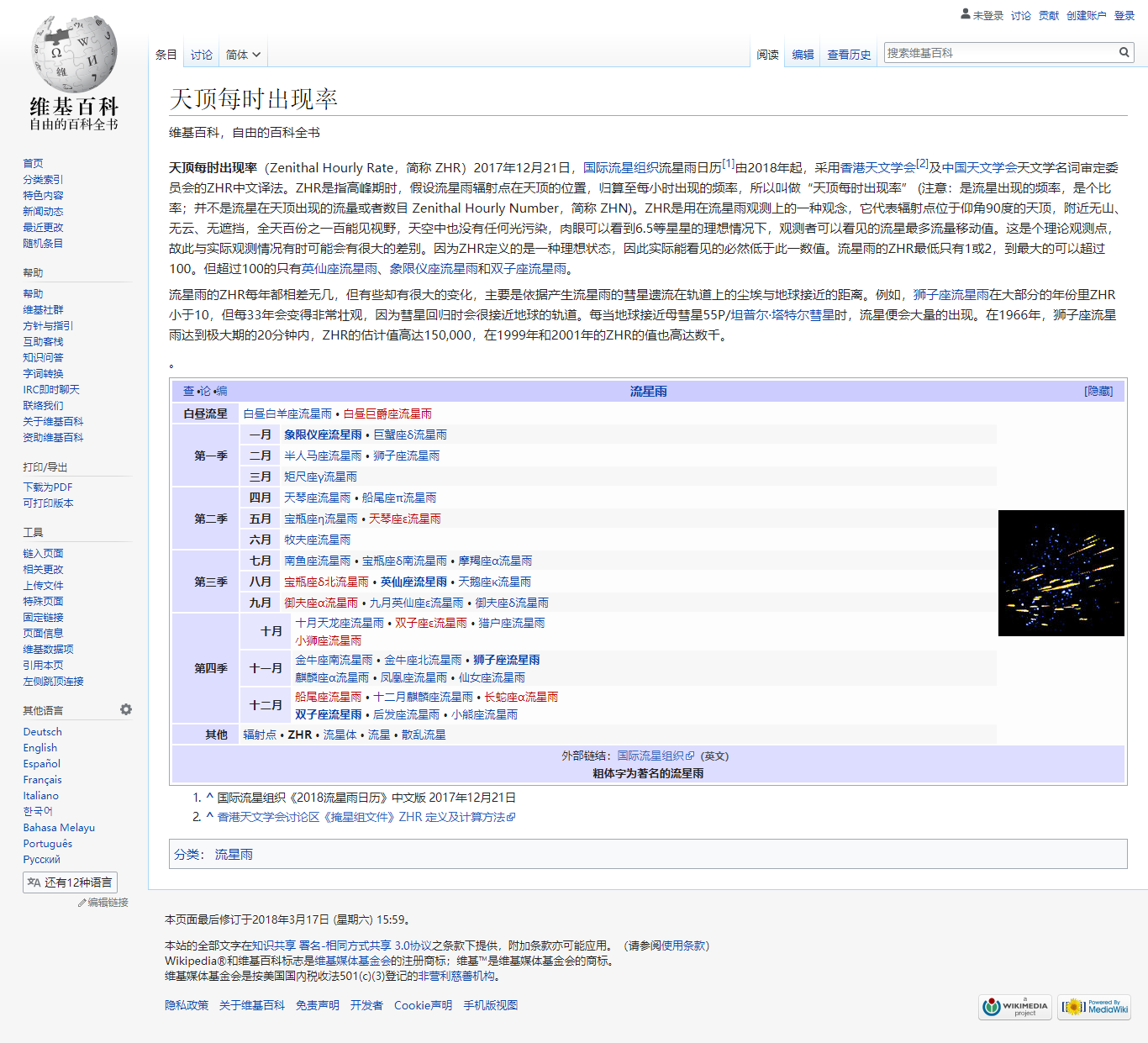 ZHR不应该译作“每小时天顶流星数”,国际流星组织(IMO)也没有Zenith Hourly Number,ZHN(天顶每小时流星数量)这一类的词。维基百科以及百度百科已按照国际流星组织2017年12月21日上线的《2018流星雨日历》中文版,将ZHR的中文翻译为“天顶每时出现率”。