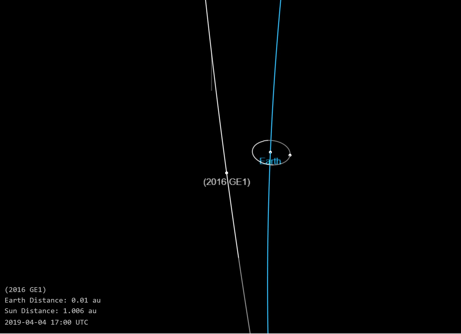 一颗在2016年4月2日发现,临时编号2016 GE1近地小行星,北京时间2019年4月5日1时26分(预测误差±4日21时39分钟,表示可能在4月1日4时至4月9日22时之间)掠过地球。由于欠缺足够观测数据,在最接近地球的时候,2016 GE1与地球的距离可能在426,478.8公里至5,320,236.4公里之间。标称距离(nominal distance)是1,492,682公里,是地球和月球之间平均距离的3.88倍(变化介乎1.11倍至13.84倍),它对地球没有任何威胁。小行星直径估计介乎16米至21米之间。