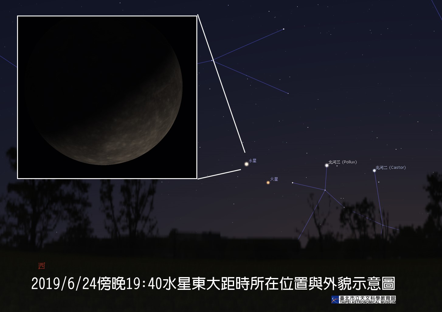 2019/6/24的07:16,水星达今年第2次东大距位置,同时也是今年内日没时水星仰角最高的时候,此时水星与太阳之间的日距角约为25.2度,日落时在西方的仰角超过20度,在6/16-6/24期间最高达22度,不过亮度仅约+0.4等,受暮日晖光的影响,不是那么容易看见。建议可用双筒望远镜或拍照方式协助观赏。