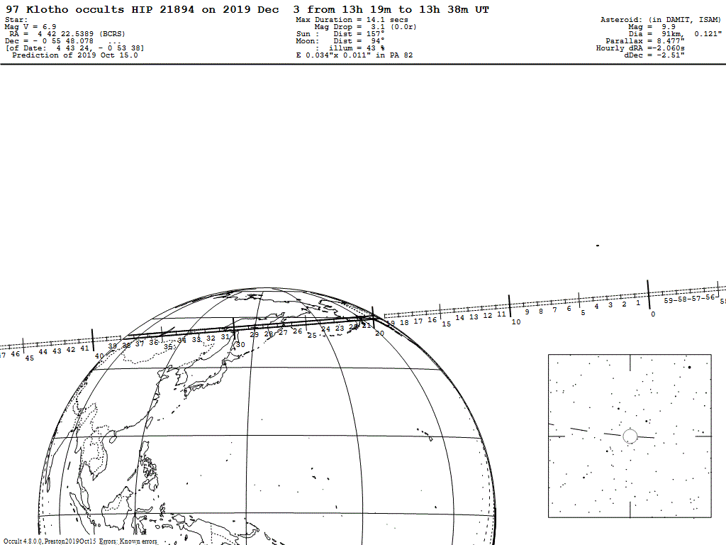 小行星掩星相当于观测一次迷你日食。北京时间2019年12月3日(星期二)晚上,直径约82.8km,光度9.9等97号小行星纺神星(Klotho)掩波江座6.9等恒星HIP 21894(HS Eri,HD 29870),历时14.1秒,减光(星等下降)3.1等,距离月球94度。中国最北端的黑龙江大兴安岭北部地区可见。见掩时间以中心线最长,随着向南、北界限线递减至零。须用一架天文望远镜和校过时的仪器(帧频至少精确到10帧/秒)观测记录。也请注意防寒保暖。纺神星是第97颗被人类发现的小行星,于1868年2月17日发现。纺神星的名字来自希腊神话中的命运女神克洛托。