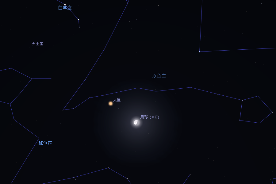 火星:在双鱼座顺行。约于夜晚21时50分升起,日出时位于西南方天空,亮度约-1.4等,后半夜观测条件不错。