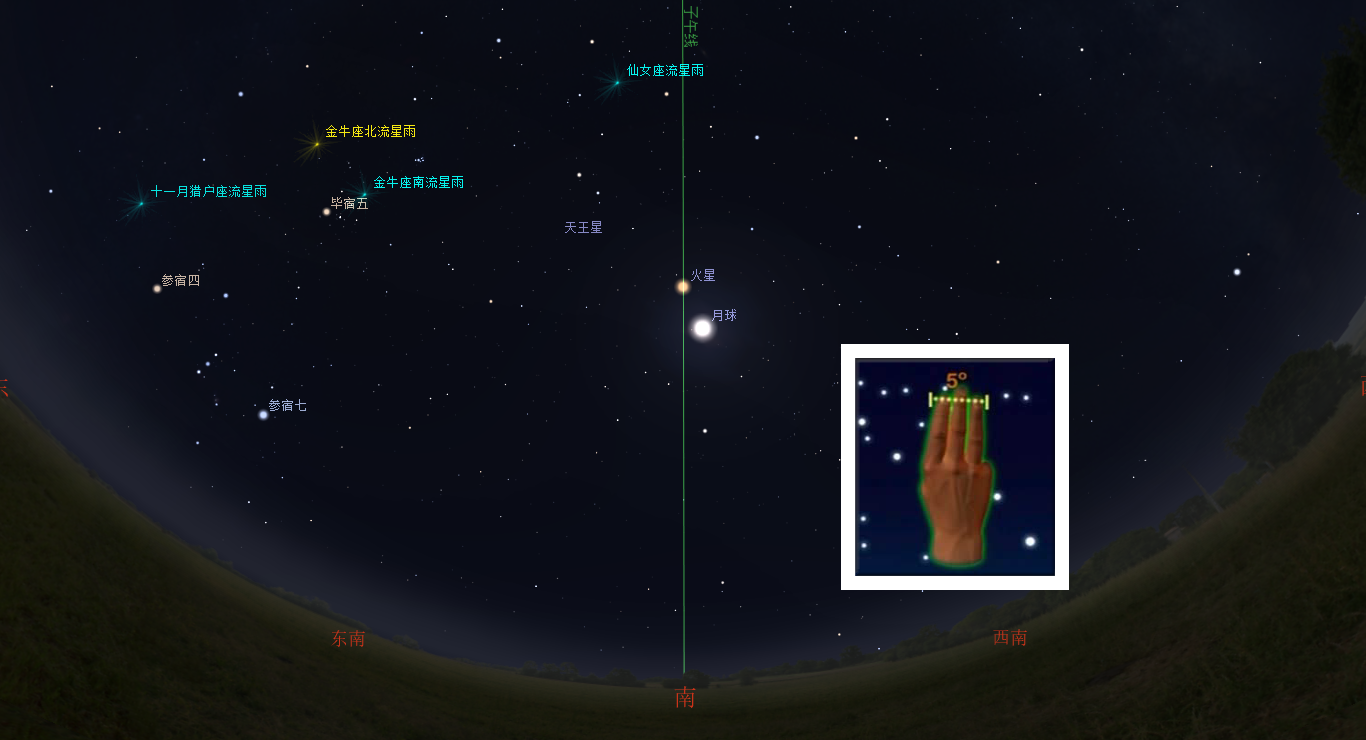 11/26 03时47分 火星合月,火星在月球以北4.90度(瞬时中天经度:11.52度)