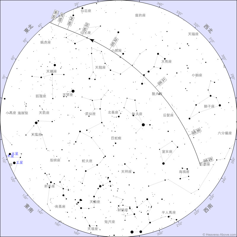 国际太空站(International Space Station,ISS)是地球的微重力实验室,在离地约400公里倾角51.6度的轨道由西向东绕行(约90分钟绕行一周)。国际太空站的亮光来自于反射太阳光,因体积较大、轨道较低是容易观察的人造卫星。当于黎明或黄昏通过上空,距离较近、角度适合时,肉眼可见移动的亮点。2021年2月19日清晨约5点半通过台北上空的亮度达-3.7等,经过的时间及相对位置(方位、仰角)会随观测地点而有差异。下方图片为以台北天文馆为观测点计算而得。