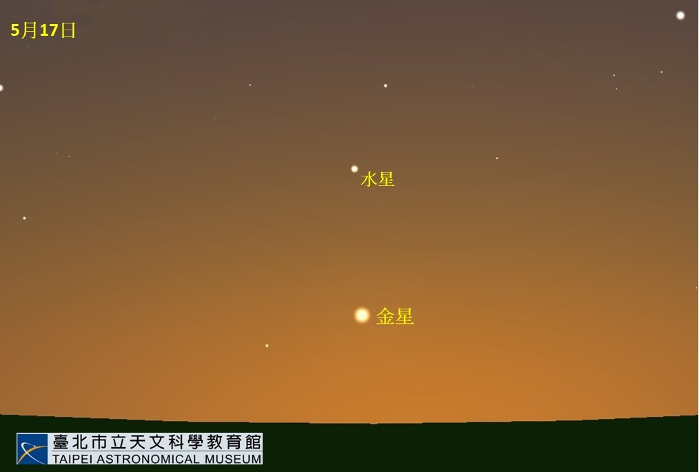 2021年5月17日13时54分,水星到达东大距位置,与太阳的距角为22.0度,亮度为0.4星等。由于水星是内行星,平时都在太阳附近难以观察,只有在「大距」时(指水星与太阳视角距离最大),才较容易观看。以此次东大距为例,水星在太阳东方视角最远处,因此日落后,有机会在西方低空处找到水星。此外,今年有3次东大距,这次是第2次,虽然日距角不是最远的一次,但水星与太阳连线与地平线较垂直,在日落时水星仰角相较为高,因此较容易观测。当天金星距离水星不远,约8度。由于金星非常明亮,可以利用金星为寻找水星的指标,更容易找到它。(编辑/台北天文馆助理研究员李瑾)