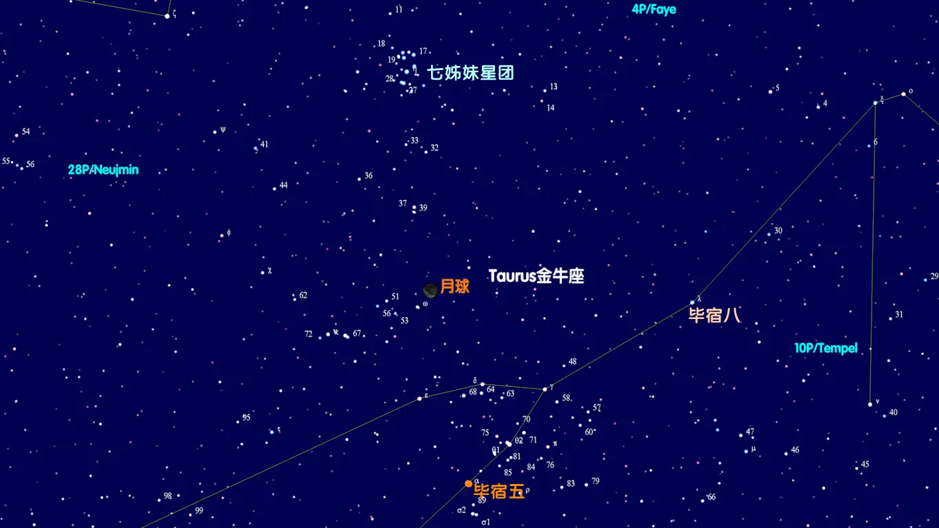 8/30 22时55分 毕宿五合月,毕宿五在月球以南5.95度