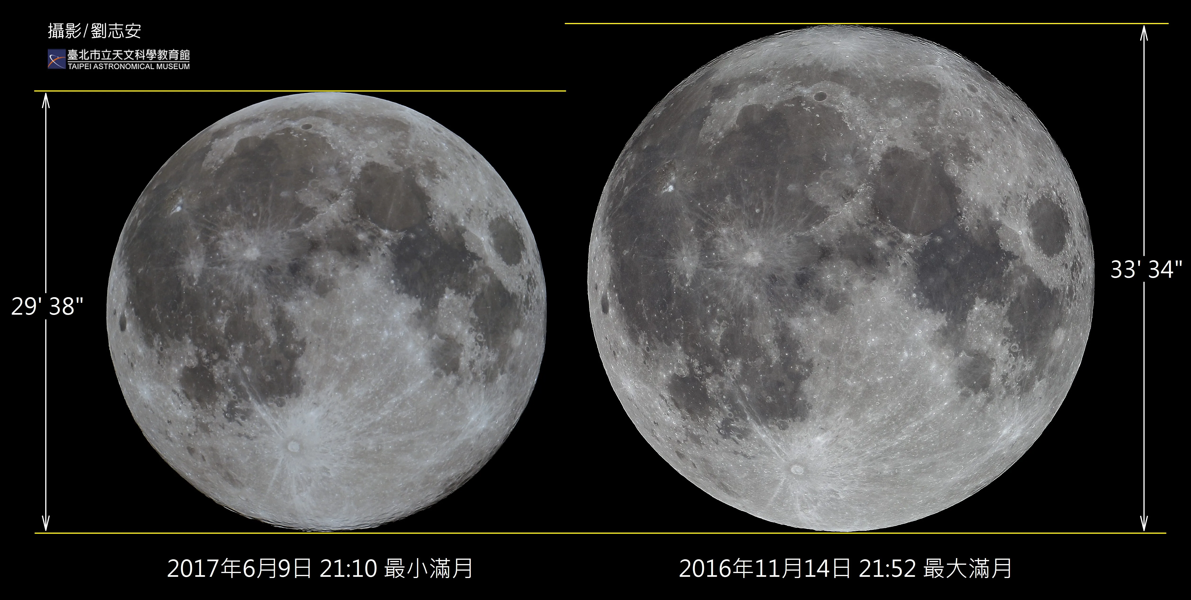 满月时视直径不同,是因为月球绕地球的公转轨道为椭圆形,地球位在椭圆形的其中一个焦点上。这使得月球和地球之间的距离有远有近,其中离地球最近的位置称为近地点,最远的位置称为远地点。从地球上观察,当月亮离地球较近时,看起来的视直径比较大;反之,远时看来较小。