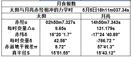 地方视午(或视子夜)的中心食表示太阳和月亮赤经相合的时刻,并列出月影锥轴与地面交点的经纬度。
