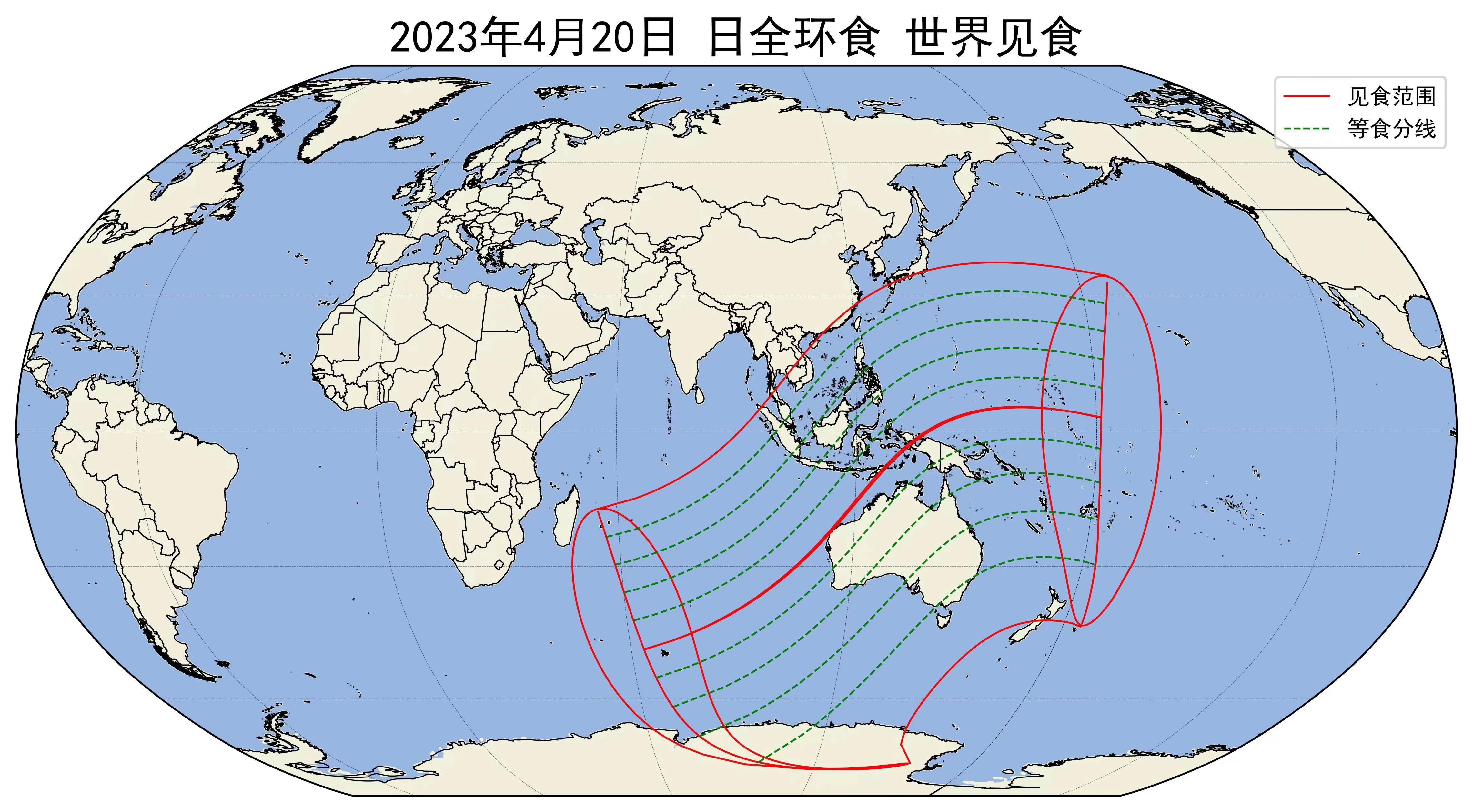 2023年的日月食是根据VSOP87/ELP2000-82历表结合日月食理论计算而来,本年一共发生两次日食、两次月食,其中4月20日的全环食,我国浙江极东南部、福建东南部、广东东南部、海南东南部、台湾东南部及南海群岛可见日偏食。本年日月食地图使用新版日月食计算软件绘制,由于计算方法的不同,可能会与其他资料值差1~2秒。同时对@张雷,@常金龙,@杨旸,@宗洋等同好的大力帮助,在此一并表示感谢。