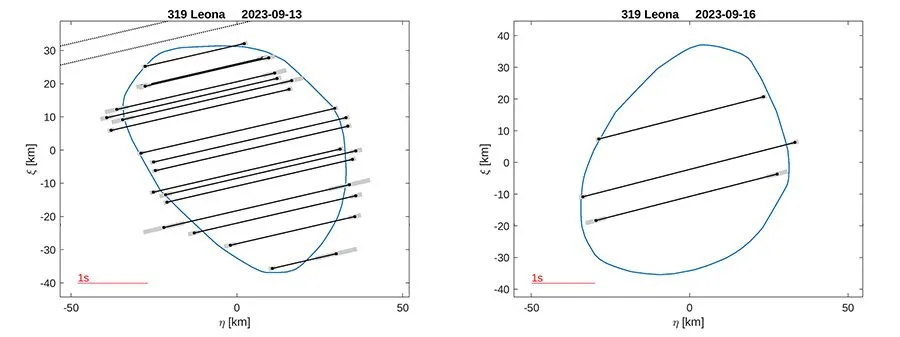 根据2023年9月的掩星观测显示,小行星Leona的直径约介于50至80公里之间,这颗小行星有点椭圆,甚至可借由先前的观测资料建立初步的3D模型,预计它的轮廓在当天的视直径可能为46×41毫角秒,参宿四在天空中的视直径则约为40毫角秒,参宿四自身大气的变化也可能会使它看起来成为稍大的50毫角秒,中心线上的参宿四是否会被完全遮挡还须仰赖各处天文爱好者的观测。