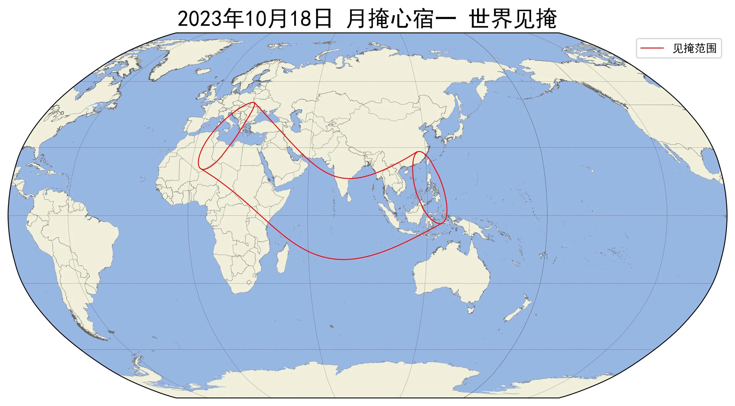 10月18日 21时53分 心宿二合月,心宿二在月球以南0.83度(欧洲、非洲北部发生月掩心宿二)