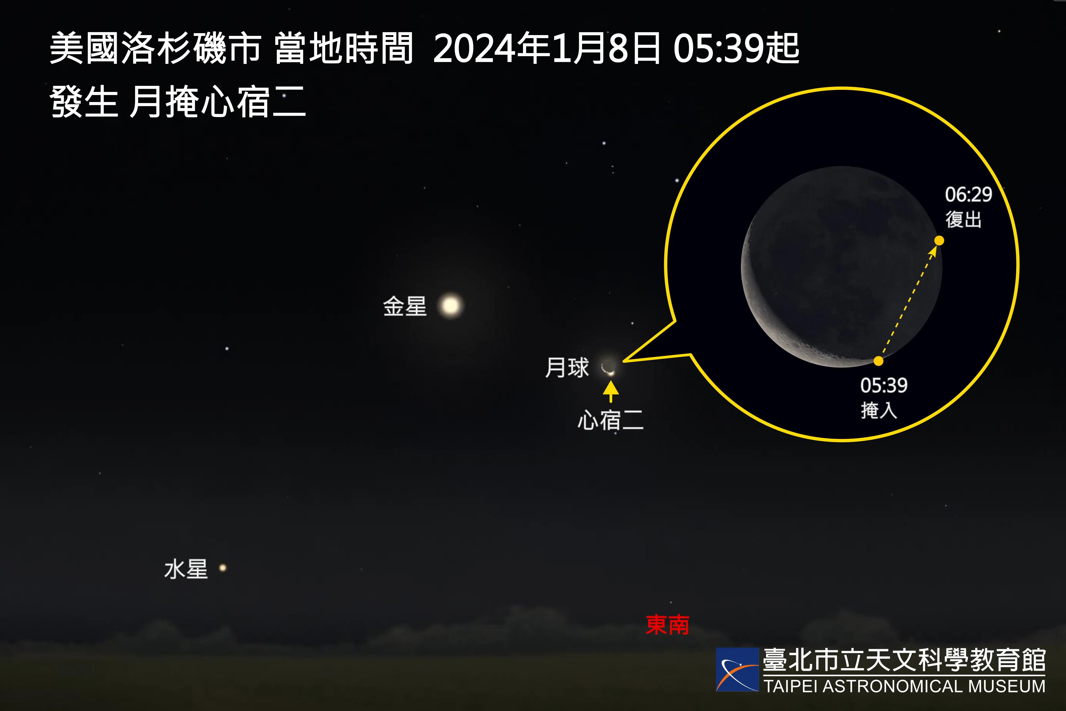 图说:在美国洛杉矶市,于当地时间2024年1月8日05时39分起月掩心宿二。以上示意图由Stellarium软体产生。