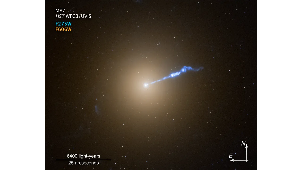 天文学家使用哈勃太空望远镜观测M87星系中超大质量黑洞的喷流时,意外发现新星爆发(novae)在喷流方向上似乎较为频繁。虽然这些新星并未被捲入喷流,但它们处于喷流附近的危险地带。这一发现令研究人员感到困惑,显示我们对黑洞喷流与其周围环境的相互作用仍有未解之处。这道喷流是由一个质量为65亿倍太阳质量的黑洞发射,长达三千光年,并以接近光速穿越空间。任何被捲入喷流中的物体都将被摧毁。